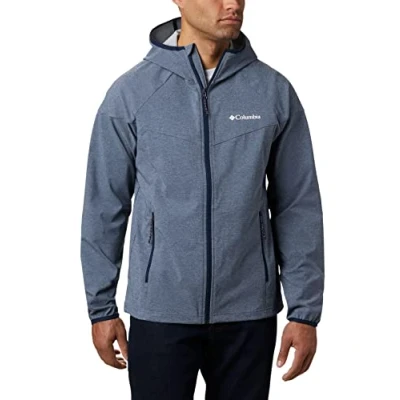 Sleek-looking softshell men's jacket with hood and comfort-stretch fabric, Ideal for hiking, outdoor activities and everyday errands, Active fit Practical full-length zipper, 2 zippered hand pockets for warmth and security Drawcord hem for perfect comfort, Durable lightweight polyester, Chin guard Jacket for year-round use: Water-resistant fabric, With encompassing hood and elastic cuffs Contents: 1x Columbia Men's Softshell Jacket, Heather Canyon, Colour: Blue (Collegiate Navy Heather), Size: S, Art.: 1714111