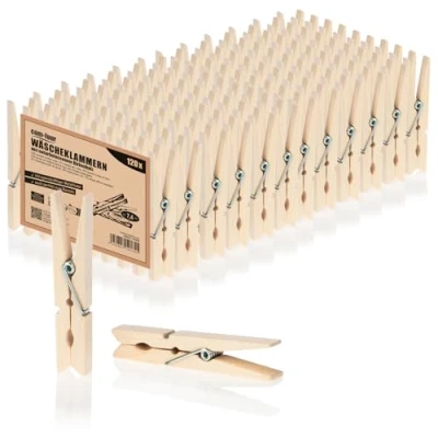 NATURAL: The birch wood clothespins with strong metal springs are untreated and should not be missing in the household or when camping! HIGH QUALITY: The sturdy wooden pegs are ideal for attaching laundry to a line and to keep it from falling down in the wind! SUSTAINABLE: The environmentally friendly birch wood clothespins are made of a biodegradable raw material and are free of plastic! WEATHER-RESISTANT: The clips withstand the weather and can be used outside on the clothesline as well as inside on the clothes horse! SCOPE OF DELIVERY: 120x clothes pegs // Dimensions: approx. 7.4 x 1 x 1.5 cm (length x width x height) // Material: birch wood, metal // Color: light brown (natural color)