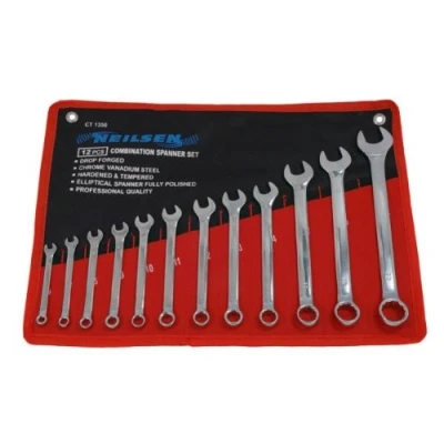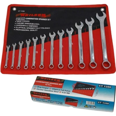 General description A high-quality Neilsen 12 piece combination spanner set designed for both professional and DIY use. The spanners are constructed from drop forged chrome vanadium steel, ensuring added strength and durability. This set is supplied in a handy storage bag for protection and easy transportation. Technical specifications Number of pieces: 12 Sizes: 6mm, 7mm, 8mm, 9mm, 10mm, 11mm, 12mm, 13mm, 14mm, 17mm, 19mm, 22mm Material: Drop forged chrome vanadium steel Spanner lengths: 6mm (100mm), 7mm (110mm), 8mm (120mm), 9mm (130mm), 10mm (140mm), 11mm (150mm), 12mm (160mm), 13mm (170mm), 14mm (180mm), 17mm (210mm), 19mm (230mm), 22mm (260mm) Other information Supplied in a handy storage bag