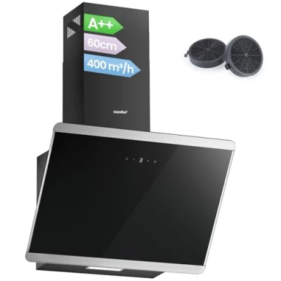 COMFEE' 60cm Angled Cooker Hood Class A++ Tempered Glass Extractor with Touch Screen, LED and Recirculating & Ducting System Wall Mounted Fan kitchen, Black