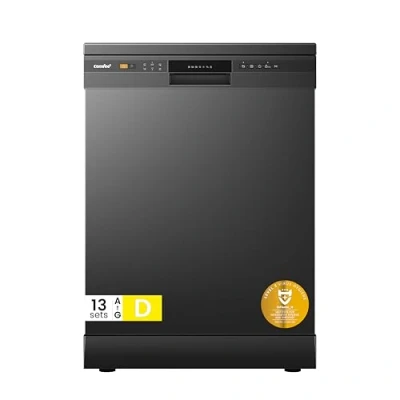 【Easy Control】The black dishwasher is 13 place setting with 6 washing program (Intensive, ECO, 90 min, Rapid, Glass and Hygiene) and 4 special funtions (Auto open, Half load, Delay start and Child lock), providing flexible options for every different cleaning need. 【Energy Efficiency】This COMFEE freestanding dishwasher is rated Energy Efficiency Class D, with an eco program consuming only 0.836 kWh of energy and 11 litres of water per cycle. 【30min Quick Wash】Choose the Rapid cycle to get your dishes sparkling clean within 30 minutes if you are in a hurry. 【72℃ Hygiene Wash】Awarded the Golden Virus Hygiene Seal, COMFEE' hygiene wash helps remove the most stubborn of stains, leaving your dishes and glassware clean and hygienic. 【Half Load Function】The half load function gets smaller loads washed, using 30% less energy than a full load cycle (it can be used with Intensive, ECO, 90 min, Glass and Hygiene Program). 【Auto Door Open Drying】After washing, the door will open automatically to achieve better drying effect. (It can only be used with Intensive,ECO,90min,Glass,Hygiene) *Please kindly note that a little water residual in a new machine is normal, because it has undergone manufacturer’s quality tests to ensure proper operation. 【Specification】Dimesnions are H84.5 cm, W59.8 cm and D60 cm, providing a spacious and flexible interior for maximum dishware loading. It's also has been considerately designed to accommodate larger plates, pots & pans up to 30cm in diameter.