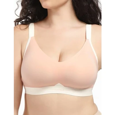 COMFELIE Wireless Bra for Women, Seamless Comfort, Lightly Lined Color Block V Neck Everyday Bra, Oyster Pink, M