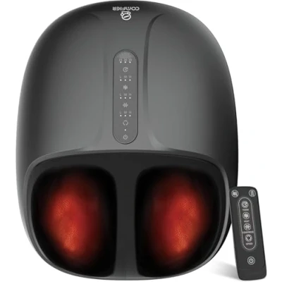 3-level adjustable temperature: the COMFIER foot massager with heat function has a new double heating function, which simultaneously heats the sole of the foot and the arch of the foot. The Shiatsu foot massager also has three adjustable heat settings (45°C to 55°C), so you can enjoy warmth and comfort even in the cold season. Whether you have tired feet after a long day on your feet or suffer from cold feet, the heat of the heating function relieves cold and fatigue, so you can relax comfortably 3 MASSAGE INTENSITY LEVELS The COMFIER Heated Foot Massager for Plantar Fasciitis is not only designed to knead and massage the arch and toes in both directions and stroke over the ankles, but also has three massage intensity levels, allowing you to adjust the massage to your needs and regulate the results at any time as you like FLEXIBLE TIME CONTROL FOR SAFE MASSAGE The COMFIER heated foot massager has multiple time options of 15 minutes, 20 minutes and 30 minutes, allowing you to control the duration of the massage exactly according to your needs and avoid discomfort caused by excessive use. Suitable for feet up to EU size 46: The COMFIER foot massager has a spacious interior that comfortably accommodates feet up to EU size 46, so even those with larger feet can enjoy the soothing massage. It is suitable for the needs of the whole family Convenient Wireless Remote Control Easy Operation The COMFIER foot massager with heat function has double control with wireless remote control and control panel, which allows more convenient operation and easy adjustment of various functions without having to bend over, which is especially beneficial for the elderly. Therefore, the foot massager is a great gift for mum, dad and seniors on different holidays such as birthdays, Women's Day, Mother's Day and Father's Day