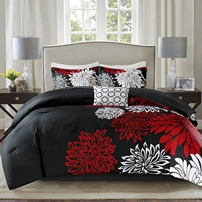 Comfort Spaces All Season Down Alternative Bedding, Matching Shams, Bedskirt, Decorative Pillows, Microfiber, Red/Black, King(104"x90")