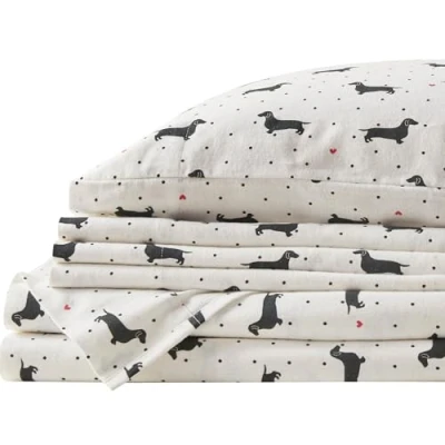 Comfort Spaces Cotton Flannel Breathable Warm, Deep Pocket Sheets with Pillow Case Bedding, Queen, Black Dog 4 Piece