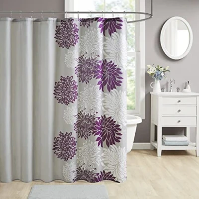 COLOR AND DESIGN ? 1 piece shower curtain; Purple, Grey ? Floral Printed MATERIAL AND FEATURES ? Microfiber polyester, measures 72(W)x72(L) inches EASY CARE - Machine wash cold on gentle cycle, tumble dry on low heat. Avoid direct heat, wash alone, no bleach, do not iron International products have separate terms, are sold from abroad and may differ from local products, including fit, age ratings, and language of product, labeling or instructions.