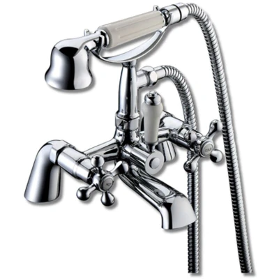 General description Comfrey Traditional Deck Mounted Bath Shower Mixer by Hydros in White and Chrome features a polished chrome finish and is manufactured with durable brass. This stylish mixer is designed for easy use with cross head style handles and includes a diverter to switch between bath filling and showering. Technical specifications Material: Brass Finish: Polished chrome Pressure requirement: 1 bar Compatibility and accessories Supplied with hose and traditional handset Includes washers and fixing nuts Other information Lifetime guarantee