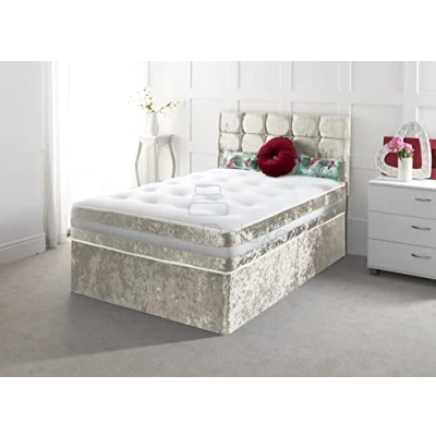 CRUSHED VELVET UPHOLSTERY | The Comfy Deluxe LTD 4FT6 double divan bed set is upholstered in soft crushed velvet, offering a sleek finish that enhances the look of your bedroom while providing everyday comfort. This 4FT6 double bed frame is perfect for creating a cozy and inviting space in any bedroom. MADE IN THE UK | This divan bed frame is proudly made in the UK, built to meet high manufacturing standards for quality, durability, and long-term use. MATTRESS & HEADBOARD INCLUDED | This double bed set includes a memory foam sprung mattress and a matching 20-inch cube headboard, delivering comfort, support, and a clean modern appearance. OPTIONAL STORAGE DRAWERS | Choose from no storage or drawer options depending on the size selected, providing a practical solution to keep bedding and essentials neatly stored. STABLE SUPPORT WITH GLIDER FEET | The bed divan base offers a firm and supportive sleeping platform and is finished with sturdy glider feet to keep the bed secure and well-balanced.