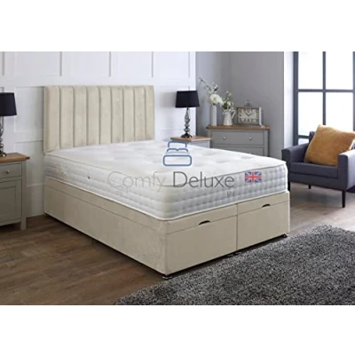 UPHOLSTERY SOFT VELVETTO FABRIC | The Comfy Deluxe LTD ottoman bed double is upholstered in soft-touch velvetto, delivering a smooth, luxurious feel and a modern look. This double bed is ideal for compact bedrooms or guest rooms where style and functionality matter. MADE WITH CARE IN THE UK | Every ottoman bed base is crafted in-house in the United Kingdom to ensure consistent quality, strength, and attention to detail. Built to perform reliably for everyday use. 26-INCH VERTICAL LINED HEADBOARD INCLUDED | This ottoman divan bed with storage comes complete with a matching 26-inch Apollo vertical lined headboard, featuring a clean vertical panel design that adds a contemporary and elegant focal point to your bedroom. FULL OTTOMAN GAS LIFT STORAGE | Designed with a smooth gas lift mechanism, this ottoman bed double opens easily from the foot end to reveal generous built-in storage. Ideal for storing bedding, clothing, and everyday essentials while maximising floor space. SOLID DIVAN BASE FOR STRONG SUPPORT | The solid platform ottoman bed base provides a stable and supportive foundation. Built for durability, it offers secure mattress support while maintaining a sleek, modern profile.