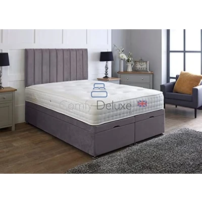 UPHOLSTERY SOFT VELVETTO FABRIC | The Comfy Deluxe LTD ottoman bed double is upholstered in soft-touch velvetto, delivering a smooth, luxurious feel and a modern look. This double bed is ideal for compact bedrooms or guest rooms where style and functionality matter. MADE WITH CARE IN THE UK | Every ottoman bed base is crafted in-house in the United Kingdom to ensure consistent quality, strength, and attention to detail. Built to perform reliably for everyday use. 26-INCH VERTICAL LINED HEADBOARD INCLUDED | This ottoman divan bed with storage comes complete with a matching 26-inch Apollo vertical lined headboard, featuring a clean vertical panel design that adds a contemporary and elegant focal point to your bedroom. FULL OTTOMAN GAS LIFT STORAGE | Designed with a smooth gas lift mechanism, this ottoman bed double opens easily from the foot end to reveal generous built-in storage. Ideal for storing bedding, clothing, and everyday essentials while maximising floor space. SOLID DIVAN BASE FOR STRONG SUPPORT | The solid platform ottoman bed base provides a stable and supportive foundation. Built for durability, it offers secure mattress support while maintaining a sleek, modern profile.