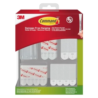 DAMAGE-FREE DECORATING: Say goodbye to holes and sticky residue on your walls; Command Fixing Solutions are the alternative to double sided tape, drawing pins and tack; They are easy to use and help you decorate your walls without leaving any marks; Decorate, organise and celebrate damage free with Command INCLUDES: 2 Sticky Nails, 12 poster strips, 6 large adhesive strips, 8 pairs small and 6 pairs large picture hanging strips NO TOOLS REQUIRED: Command Fixing Solutions are self adhesive and easy to apply; Hang your home decor where you want without nails or a hammer EASY CLEAN REMOVAL: Command Picture Hangers and Adhesive Strips, a damage-free hanging solution can be removed without leaving any residue; Lightly hold the top of the removable adhesive strip and slowly pull straight down towards the floor to remove decor and prevent damage of walls and surfaces STRONG AND VERSATILE: Command hangers, adhesive strips and picture hanging strips hold strongly on a variety of indoor surfaces including painted walls, finished wood, painted concrete cinder blocks, laminate, glass, metal and tiles; The picture hanging kit provides versatile solutions to hang picture frames, wall art, mirrors, wall clocks, signs, dry erase boards, decorations, posters, and other home decor where you want without nails or a hammer RECOMMENDED SURFACES: Command adhesive strips hold strongly on a variety of indoor surfaces including painted walls, finished wood, painted concrete cinder blocks, laminate, glass, metal and tiles PACKAGING: Packaging for this item is made with FSC Mix certified fibre with minimum of 90% recycled content; All glues and varnishes used to produce the packaging are solvent-free; The packaging is 100% recyclable in existing household waste streams Warnings: Do not hang over beds; Do not use on wallpapers, delicate or weak surfaces; Do not hang valuable items; Failure to follow instructions may result in damage or injury Indoor use only; Recommended for use on painted walls, finished wood, painted concrete cinder blocks, laminate, glass, metal and tiles; Hang picture frames, wall art, small mirrors, wall clocks, signs, dry erase boards and other home decor, Weight: 0.39929463506654 Pounds, Manufacturer: 3M