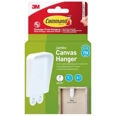 Command Jumbo Canvas Hanger Hook, Pack of 1 Hook and 4 Adhesive Strips, White Damage Free Hanging For Framed Pictures, Prints Art Holds up to 2.2kg