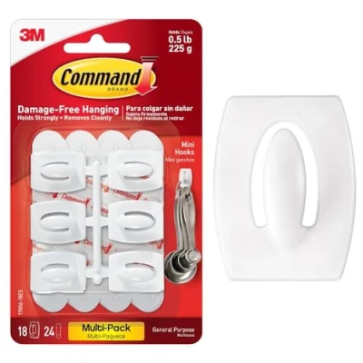 Command Mini Hooks, Value Pack of 18 Hooks and 24 Adhesive Strips, White Damage Free Wall