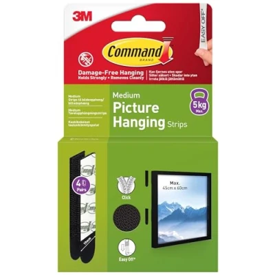 DAMAGE-FREE DECORATING: Say goodbye to holes and sticky residue on your walls; Command Picture Hanging Strips are easy to use and help you decorate your walls without leaving any marks NO TOOLS REQUIRED: Command Picture Hanging Strips are self adhesive and easy to apply; Hang picture frames, wall art, small mirrors, wall clocks, signs, dry erase boards, and other home decor without nails, screws and tools EASY CLEAN REMOVAL: Command Picture Hanging Strips, a damage-free hanging solution can be removed without leaving any residue; Lightly hold the top of the removable adhesive strip and slowly pull straight down towards the floor to remove decor and prevent damage of walls and surfaces STRONG AND VERSATILE: 2 pairs of medium strips can hold one frame weighing up to 2.5 kg, and measuring up to 30 cm x by 45 cm; 4 pairs of medium strips can hold one frame weighing up to 5 kg, and measuring up to 45 cm by 60 cm RECOMMENDED SURFACES: Command strips hold strongly on a variety of indoor surfaces including painted walls, finished wood, painted concrete cinder blocks, laminate, glass, metal and tiles PACKAGING: Packaging for this item is made with FSC Mix certified fibre with minimum of 90% recycled content; All glues and varnishes used to produce the packaging are solvent-free; The packaging is 100% recyclable in existing household waste streams INCLUDES: 4 Pairs of Medium (19 mm x 70 mm), Black Command Picture Hanging Strips (8 Strips total) Warnings: Do not hang over beds; Do not use on wallpapers, delicate or weak surfaces; Do not hang valuable items; Failure to follow instructions may result in damage or injury GENUINE QUALITY : Whether your Command Picture Hanging Strips come with a green printed or transparent liner, rest assured they are authentic Command products, offering the same reliable performance for all your picture hanging needs Indoor use only; Recommended for use on painted walls, finished wood, painted concrete cinder blocks, laminate, glass, metal and tiles; Hang picture frames, wall art, small mirrors, wall clocks, signs, dry erase boards and other home decor, Manufacturer: 3M