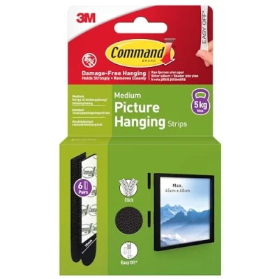 DAMAGE-FREE DECORATING: Say goodbye to holes and sticky residue on your walls. Command Picture Hanging Strips are easy to use and help you decorate your walls without leaving any marks NO TOOLS REQUIRED: Command Picture Hanging Strips are self adhesive and easy to apply. Hang picture frames, wall art, small mirrors, wall clocks, signs, dry erase boards, and other home decor without nails, screws and tools EASY CLEAN REMOVAL: Command Picture Hanging Strips, a damage-free hanging solution can be removed without leaving any residue. Lightly hold the top of the removable adhesive strip and slowly pull straight down towards the floor to remove decor and prevent damage of walls and surfaces STRONG AND VERSATILE: 2 pairs of medium strips can hold one frame weighing up to 2.5 kg, and measuring up to 30 cm x by 45 cm. 4 pairs of medium strips can hold one frame weighing up to 5 kg, and measuring up to 45 cm by 60 cm RECOMMENDED SURFACES: Command strips hold strongly on a variety of indoor surfaces including painted walls, finished wood, painted concrete cinder blocks, laminate, glass, metal and tiles PACKAGING: Packaging for this item is made with FSC Mix certified fibre with minimum of 90% recycled content. All glues and varnishes used to produce the packaging are solvent-free. The packaging is 100% recyclable in existing household waste streams INCLUDES: 6 Pairs of Medium (19 mm x 70 mm), Black Command Picture Hanging Strips (12 Strips total) Warnings: Do not hang over beds. Do not use on wallpapers, delicate or weak surfaces. Do not hang valuable items. Failure to follow instructions may result in damage or injury, Manufacturer: 3M