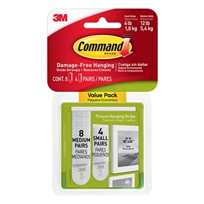 INCLUDES- 4 Pairs of Small, 8 Pairs of Medium, White Command Picture Hanging Strips (24 Strips total); 4 Small Pairs hold 4 lbs. Maximum frame size of 8 inches x 10 inches, 4 Medium Pairs hold 12 lbs. Maximum frame size of 18 inches x 24 inches DAMAGE-FREE DECORATING- Say goodbye to holes, marks, or sticky residue on your walls; Command Picture Hanging Strips by 3M are easy to use and help keep your walls looking beautiful NO TOOLS REQUIRED- Hang picture frames, wall art, mirrors, wall clocks, signs, dry erase boards, holiday decorations, acoustic foam boards, and other home decor where you want without nails or a hammer STRONG AND VERSATILE-Command Strips hold strongly on a variety of indoor surfaces including painted walls, finished wood (painted or varnished shiplap, cabinets, or doors), painted concrete cinder block, laminate, glass, tile, metal, other smooth surfaces REMOVES CLEANLY- Redecorate when inspiration strikes. These picture hangers leave no sticky adhesive behind. Perfect for your dorm, apartment, home, and office, Weight: 0.03 Pounds, Manufacturer: 3M