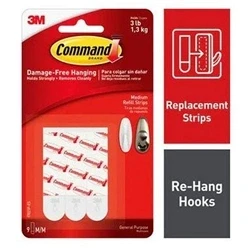 INCLUDES - 9 Indoor Small Replacement Strips. RE-HANG HOOKS Reorganize when inspiration strikes! Command Small Refill Strips make it easy to hang and rehang your Command indoor hooks, damage-free.