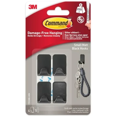 DECORATE DAMAGE-FREE: Say goodbye to holes, marks, or sticky residue on your walls, doors, cabinets, or cupboards; Command Hooks by 3M are easy to use and help keep your walls looking beautiful NO TOOLS REQUIRED: Hang clipboards, dog leads, kitchen utensils, and accessories where you want without nails or a hammer STRONG AND VERSATILE- Command Utility Hooks hold strongly on a variety of indoor surfaces including painted walls, finished wood, glass, tile, metal, and other smooth surfaces REMOVES CLEANLY- Reorganise when inspiration strikes; These wall hooks leave no sticky adhesive behind; Perfect to use inside cabinets, cupboards and wardrobes, in your apartment, home, and office Ideal for hanging small wall décor or for party decorations Suitable for a variety of indoor surfaces, such as painted drywalls, finished wood, tile, metal and glass Pack contents: 4 Hooks and 5 Small Clear Strips Damage-Free Hanging Easy to hang - no tools required Colour: Matte Black, Manufacturer: 3M