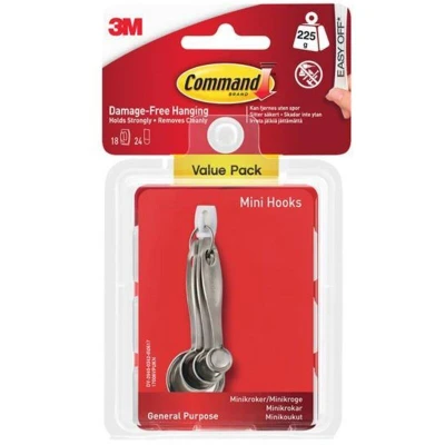 General description Command™ White Mini Hooks are perfect for hanging keys, jewelry, party decorations, and various household items. This Value Pack includes 18 hooks and 24 adhesive refill strips, providing a convenient solution for your hanging needs. Technical specifications Number of hooks: 18 Adhesive refill strips: 24 Holding power: up to 225g per hook Usage Ideal for hanging items without causing damage to surfaces Suitable for most smooth surfaces including painted walls, tiles, metal, and wood Other information Damage-free hanging, holds strongly and removes cleanly Easy to apply, no need for nails, screws, or drills Strips stretch off cleanly without leaving holes, marks, or sticky residue