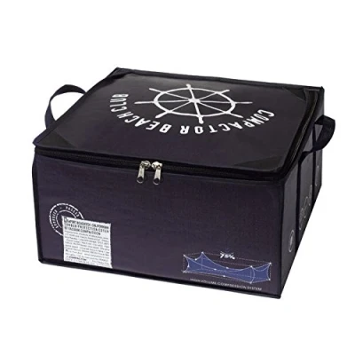 All-in-one vacuum storage system - the vacuum bag is built in to the protective tote to create a single, stylish storage solution which is ideal for bulkier items and more delicate linens Tote is designed to hold the equivalent of 1 double duvet and 1 pillow (168l capacity) Built in vacuum bag has the patented universal Compactor non return valve, items are compressed vertically and so can be folded and placed in to the bag one on top of the other Made from strong, durable materials and partly reinforced to protect the contents and ensure the internal vacuum bag keeps its shape while remaining flexible and airtight Contents: 1 x Vacuum Storage Tote W50 x D50 x H25cm, 1 closing slider