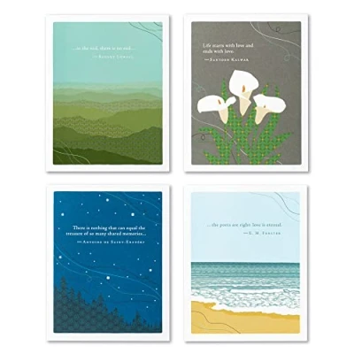 Share your support during difficult times with this assortment of sympathy cards. Compendium’s bestselling Positively Green greeting cards combine beautiful illustrations and inspiring quotes to mark life’s moments with heart. This pack contains 4 different sympathy cards with white envelopes. Printed in the USA with FSC-certified, 100% post-consumer recycled paper. Each card is 4.25"W x 5.38"H. MOUNTAIN HORIZON — Cover Quote: "…in the end, there is no end…" -Robert Lowell — Inside Copy: May the presence of such endless love stay with you. CALLA LILY — Cover Quote: "Life starts with love and ends with love." -Santosh Kalwar — Inside Copy: Deepest sympathies. NIGHT SKY — Cover Quote: "There is nothing that can equal the treasure of so many shared memories…" -Antoine de Saint-Exupery — Inside Copy: Wishing you peace in this time of sadness. OCEAN SHORE — Cover Quote: "…the poets are right: love is eternal." E.M. Forster — Inside Copy: Our hearts and thoughts are with you at this time and always.