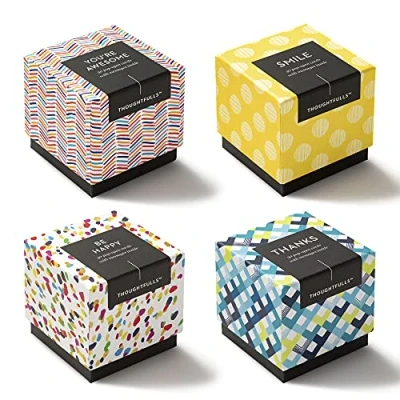 INSPIRATIONAL CARDS ThoughtFulls pop open cards are a fun way to add some extra goodness to someone. Each box of pop-open cards contains 30 uplifting quotes to evoke unexpected joy. Insert one into a greeting card, hide one in a mailbox, or leave one in a restaurant with your tip and use the hidden messages to spread kindness wherever you go THEME - INSPIRATION JOY:Included in this pack are 4 boxes of ThoughtFulls - 1 Box You're Awesome, 1 Box of Smile, 1 Box of Be Happy and 1 Box of Thank You Cards English language not guaranteed). Each box contains 30 cards, each with a unique quote to excite joy and celebrate the good things. Share them with friends, family, loved ones, colleagues or anyone who brings joy. SHARE FRIENDLY From sharing a compliment with a stranger to sending an encouraging message to a friend, the smallest, unexpected kindness can make a difference. Feature This set includes 4 boxes of ThoughtFulls, 30 pop open cards per box, total 120 pieces. Each card has a different inspirational quote inside, and the back includes space for a personal touch. SIZE:ThoughtFulls pop open cards are small and compact, just 2.25"W x 2.25"H; perfect for easy sharing, use as gift tags, or stow away for a surprise.
