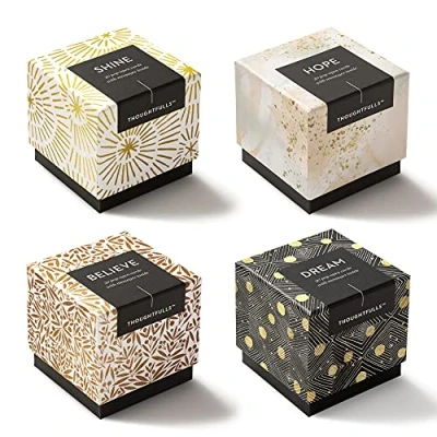INSPIRATIONAL CARDS ThoughtFulls pop open cards are a fun way to add some extra goodness to someone. Each box of pop-open cards contains 30 uplifting quotes to evoke unexpected joy. Insert one into a greeting card, hide one in a mailbox, or leave one in a restaurant with your tip and use the hidden messages to spread kindness wherever you go THEME - DREAM BIG: This pack includes 4 boxes of ThoughtFulls - 1 Box of Shine, 1 Box of Hope, 1 Box of Believe and 1 Box of Dream. Each box contains 30 cards, each with a unique quote to provide inspiration to live the life you imagine. Share them with friends, loved ones, family or anyone who could use a reminder that anything is possible. SHARE FRIENDLY From sharing a compliment with a stranger to sending an encouraging message to a friend, the smallest, unexpected kindness can make a difference. Feature This set includes 4 boxes of ThoughtFulls, 30 pop open cards per box, total 120 pieces. Each card has a different inspirational quote inside, and the back includes space for a personal touch. SIZE:ThoughtFulls pop open cards are small and compact, just 2.25"W x 2.25"H; perfect for easy sharing, use as gift tags, or stow away for a surprise.