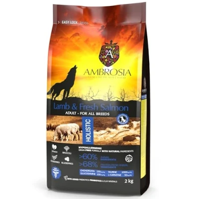 Complete Grain Free Dry Dog Food 2kg (Adults All Breed) Hydrolyzed, High Protein Food, Lamb & Fresh Salmon Flavour by Ambrosia Ultra Premium Pet Food®, Hypoallergenic