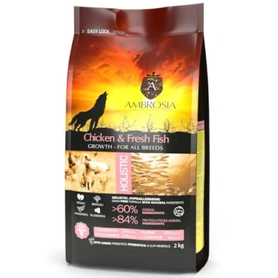 High-Quality Protein for Growth: Ambrosia Chicken & Fresh Fish combines easily digestible fresh fish (21%) and nutritional chicken protein (19%) to support muscle, brain, skin, and hair development in puppies of all breeds. Grain-Free & Hypoallergenic: This superior grain-free kibble is free from GMO ingredients, cereals, corn, and soy, making it ideal for sensitive stomachs and promoting optimal nutrient absorption Digestive & Immune Support: Infused with prebiotics, probiotics, and superfoods like broccoli, spinach, cranberries, and blueberries to enhance gut health and boost immunity. Skeletal Health Formula: Contains balanced calcium and phosphorus levels, plus glucosamine (150 mg/kg) and chondroitin (150 mg/kg), to ensure proper bone and joint development for growing puppies. Omega-Rich for Skin & Coat: Includes salmon oil and flax seed for a healthy ratio of Omega-3 and Omega-6 fatty acids, promoting a shiny coat and healthy skin.