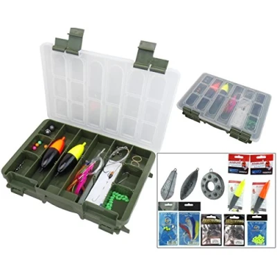 Roddarch twin tray tackle box made tough ABS plastic, with strong hinges and latches • Make up to 30 separate compartments, perfect for small or large lures, spinners, hooks weights etc. 2 x Complete sea fishing float set with hook, weight, beads etc. One Orange, one yellow. • Pre-tied Mackerel feather rigs • Pre-tied Pennel rigs Packet of Nerus Pro rig beads (20pc) • 2oz Beach Bomb sea weight • 3oz Aquapeedo sea weight 4oz Watch Weight Grip sea weight • Packet of Nerus Pro Swivels (10pc) • Packet of Nerus Pro Swivel clips (10pc)