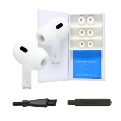 Comply Premium Foam Earplugs Compatible with Apple AirPods Pro Gen 1 & 2nd Size M, New 2025 Version Disassembly and Cleaning Tool, White, 3 Pairs, Made in The USA