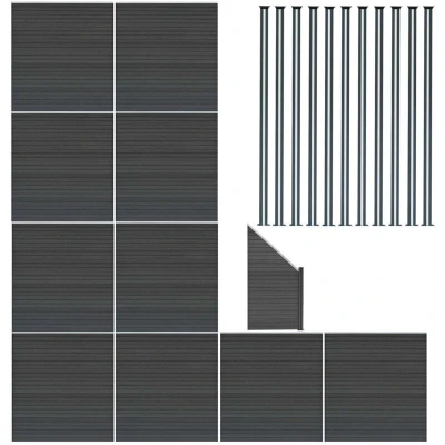 General description Transform your outdoor area with this beautifully designed composite fencing set, offering a perfect harmony of style, strength, and innovation. Supplied with 10 high-quality 6ft fence panels, 1 angled fence piece, and sturdy aluminium posts, this fencing solution is an excellent choice for defining garden boundaries or upgrading property exteriors. Crafted from 9 interlocking WPC (wood plastic composite) slats, the fence panel is designed to slot together effortlessly, forming a strong, unified structure that’s highly durable and low maintenance. Once assembled, the barrier stands at an impressive height of 185cm and a width of 1830cm, offering both privacy and a bold, contemporary presence in the garden. Technical specifications Colour: Grey Weight: 280kg Material: WPC & Aluminium Total Height: 185cm / 1.85m / 72.8” Total Width: 1830cm / 18.3m / 720.5” Total Depth: 7cm / 0.07m / 2.8” Height Per Fence Panel: 20cm / 0.2m / 7.9” Width Per Fence Panel: 170cm / 1.7m /