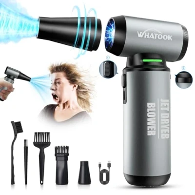 Super High Speed Wind Power:The metal compressed air duster has a maximum speed of 【200,000 RPM】, 【200G】 wind pressure, peak wind speed exceeding 【90m/s】. Electric air duster provides a powerful performance that can easily remove dirt hidden in various crevices on keyboards or any electronic devices for home, office or car use. New Pulley Mode Functional Design: The air duster is newly upgraded, not only with【3- gear mode】, but also with 【button mode】and 【pulley mode】, which is smooth sliding and more convenient and sensitive to use, and you can choose to select the size of the wind power freely according to your needs. In addition, the jet fan adopts ergonomic design, and the handle is more comfortable to touch. Mini Portable Design: The mini metal blower is only 【1.57*6 inch, 0.77 lb】, lightweight &【easy to carry, fits in pocket】, convenient for indoor and outdoor use. New upgraded Mini metal air duster, brings pleasant cleaning experience, cleaning easier! Multi-Function:Compressed air duster can easily clean keyboard cleaning kits, computer dusters, car detailing supplies, air brooms, electric leaf blowers, snow blowers, turbo fans, etc.; It is also suitable for picnics, fires, cleaning floors, and removing pet hair; when used for yard cleaning, leaves and cobwebs disappear instantly! Turbojet fans are also great for washing cars and blowing water. Powerful Battery Life & Energy Saving:The electric compressed air adopts a large capacity 【10000mAh】 battery (temperature protection, current protection, short circuit protection) to provide sufficient and long-lasting power with 【USB-TepyC Charging】 function, which can be reused many times to save costs, saving more money than air tanks. Compressed air dust collector is energy saving and environmentally friendly, recyclable, safe and durable, long service life.