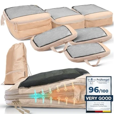 ✈️ NEVER AGAIN DISORDER WHILE TRAVELLING - Keep your travel essentials organized and easily accessible with our compression packing cube and compression bags for travel. Never worry about rummaging through your suitcase again! 🧳 FITS BAGS AND BACKPACKS - The coordinated suitcase organiser bags is designed for travelling with hand luggage suitcase (70x50x40 cm) or backpack (70l) - your new packing cubes for suitcases compression! 🧭 MORE ORGANISATION IN YOUR LUGGAGE - With the 7 packing compression cubes for travel you separate your clothes, create more space through compression and have more organization in your luggage with packing cubes for travel 💯 VERSATILE - compression packing cubes for travel for backpack in Bali, packing cubes for backpacking for your city trip as suitcase organiser bags or compression cubes for your hiking gear in the mountains as compressed packing cubes 🌍 SUPPORT THE ENVIRONMENT NOW - Global Recycled Standard compression cubes for packing was made from recycled polyester and prevent plastic from ending up in the ocean - compression packing cubes for backpack packing cubes made from rPET