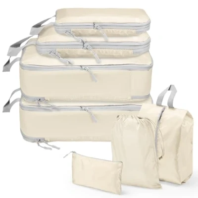 Compression Packing Cubes,Travel Storage Bag, Travel Essentials for Suitcase Organizer Bags, Organiser Carry On Luggage (Beige, Set of 7)