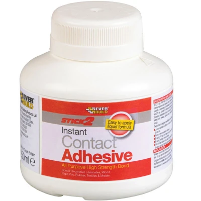 General description This Everbuild STICK2® All-Purpose Contact Adhesive is a premium grade rubber-based adhesive known for its exceptional bond strength, outperforming conventional wood glues. It is suitable for both professional and DIY projects, providing reliable adhesion for a wide variety of materials in internal and external applications. Technical specifications Type: All-Purpose Contact Adhesive Size: 250ml Material Compatibility: Decorative laminates, wood, rigid PVC, ABS, leather, cork, linoleum, rubber, stone, metals, dense fabrics Weather Resistance: Excellent for outdoor use Performance: Superior bond strength Compatibility and accessories Compatible with a wide range of materials including plastics, metals, and fabrics Suitable for bonding laminates, wood, PVC, leather, cork, and rubber Installation Apply to clean, dry surfaces for best results Use a brush or roller to spread the adhesive evenly Press surfaces together firmly and hold until bonded Usage Ideal for bonding