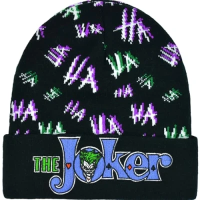The Joker Beanie: black acrylic hat The Joker knitted hat with hahaha all over the winter hat ONE SIZE FITS MOST The winter hat can accommodate men and women of all shapes and sizes and slips on easily for instant comfort 100% Acrylic: the beanie hat is made of lightweight and durable knitted acrylic fabric to keep your ears warm when hiking, outdoor sports or running outdoors in cold winter weather OFFICIALLY LICENSED This rimless cap is an officially licensed DC Comics product ensuring you receive a high quality knit hat HAND WASH ONLY: skull cap recommended for hand wash only, lay flat to dry, do not iron
