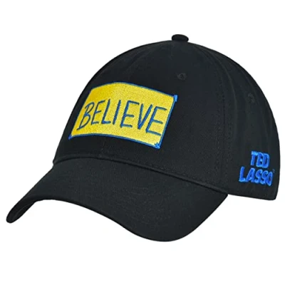 TED LASSO BASEBALL HAT: Black cotton ball cap featuring an embroidered "Believe" design from the Ted Lasso TV show on the front of the crown ONE SIZE: Dad hats feature an adjustable buckle closure to allow for easy resizing on adult men and women's heads of all shapes and sizes 100% COTTON: Soft cap is composed of 100% lightweight and durable cotton fabric to allow for instant comfort when worn, and features a curved hat bill to provide protection from bothersome sun light OFFICIALLY LICENSED: This adjustable hat is an officially licensed Apple TV+ product, ensuring you are receiving quality merchandise HAND WASH ONLY: Ball caps recommended for hand washing only, lay flat to dry, do not iron