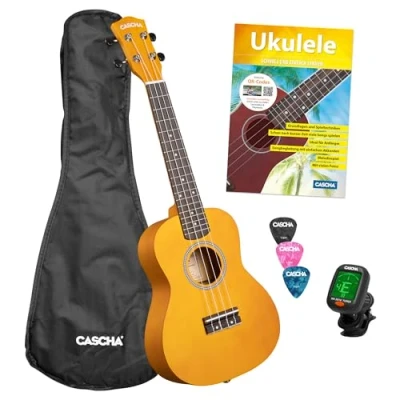 CLASSIC SOUND & STYLE: The Cascha concert ukulele offers a warm, harmonious sound and an attractive design in brown that will delight any musician. Easy to play: thanks to its handy size and the pleasant feel of the lime wood, this ukulele is ideal for beginners and advanced users Complete starter set: the set not only includes the ukulele, but also a practical bag for safe transport, a tuner, 3 picks and a ukulele school to make it easier for you to start playing ukulele. Versatile: whether at home, in the park or on the go, with this ukulele you can play your favourite songs anywhere and unfold your musicality. Robust construction: the Cascha concert ukulele is robust and thus ensures long-lasting fun and musical pleasure.