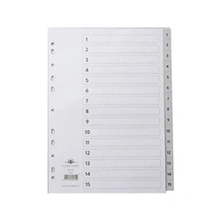 15-part index divider for ring binders. Made from hard-wearing 120 micron polypropylene plastic. Tabs with numbered 1-15 index. Pre-printed with indexing system. Euro-punched for almost any ring binder. Size: A4 (297x210mm).
