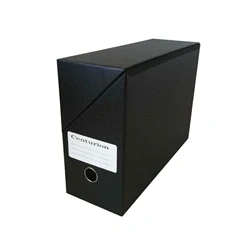 Suitable for A4 and foolscap documents. Covered in wipe clean black paper. Cloth hinges for extra durability. Metal reinforced finger ring pull to spine for easy shelf retrieval. Index label for identification of contents.