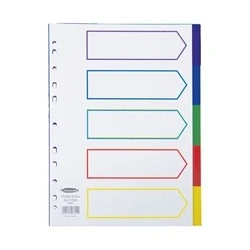 5-part divider set. Made from tear-resistant, wipe clean polypropylene. Multi-punched to fit standard lever arch files and ring binders. White with multicoloured tabs. Size: A4.