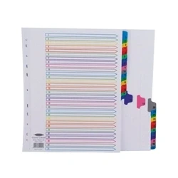 White 31-part numbered index: extra wide for use with punched pockets. Mylar-reinforced holes and tabs to resist damage. Pre-printed index page with colour-coded tabs. 4-hole punched spine fits most A4 ring binders. 180gsm quality board. Format: A4.