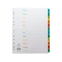White 12-part monthly index: extra wide for use with punched pockets. Mylar-reinforced holes and tabs to resist damage. Pre-printed index page with colour-coded tabs. 4-hole punched spine fits most A4 ring binders. 180gsm quality board. Format: A4.