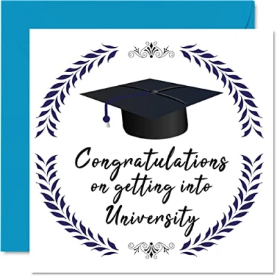 MAKE THEM SMILE WITH THIS CONGRATS CARD: This exceptional quality good for you cards for her or him shows the design "Congratulations on getting into University". If you are looking for well done gifts for women or men, then then this graduation cards female is bound to make them smile. Not just for a graduation cards male this could also be for a Friend, Son, Daughter, Brother, Sister or Cousin. WHAT DO YOU GET: The card is printed on one side and BLANK ON THE INSIDE to allow you to write your very own message. The unique fun design is printed on a specially sourced and environmentally responsible board. At 360 microns thick the natural white one-sided gloss board has a quality look and feel. Supplied with a coloured gummed envelope to complement the design and ready to be sealed and sent in the post. NO INK SMUDGES: There is nothing worse than writing inside a card to find that the shiny surface makes the ink smudge. This is why we use a high quality one sided coated board. The uncoated side will absorb more of the ink from your pen to make smudging a thing of the past, congratulations on your exam results. SIZES: Greeting Card = 145mm x 145mm, Envelope = 155mm x 155mm, Card Thickness = 360 micron. Great school leavers cards, well done cards, university uni card, exam card, gcse gifts for her, exam cards, university cards for her, degree congratulations card, congratulation card, exam pass gifts. MADE AND QUALITY CHECKED IN THE UK: We print and manufacture all our product right her in the UK so you can be sure of a fast turnaround and a product that is expertly made. Using environmentally responsible premium board our card is conscious of the responsible management of the world's forests - gcse card, congratulations exam results gifts, congratulations on passing your exams card.