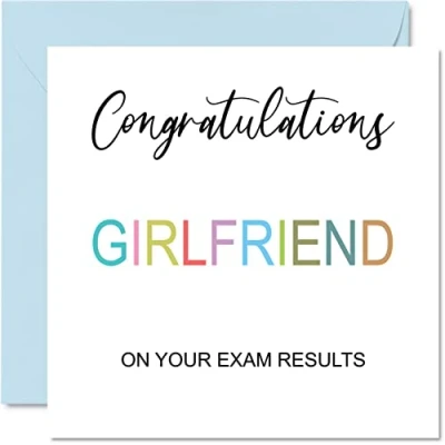 MAKE THEM SMILE WITH THIS CONGRATS CARD: This exceptional quality good for you cards for her or him shows the design "Congratulations Girlfriend On Your Exam Results". If you are looking for well done gifts for women or men, then then this graduation cards female is bound to make them smile. Not just for a graduation cards male this could also be for a Friend, Son, Daughter, Brother, Sister or Cousin. WHAT DO YOU GET: The card is printed on one side and BLANK ON THE INSIDE to allow you to write your very own message. The unique fun design is printed on a specially sourced and environmentally responsible board. At 360 microns thick the natural white one-sided gloss board has a quality look and feel. Supplied with a coloured gummed envelope to complement the design and ready to be sealed and sent in the post. NO INK SMUDGES: There is nothing worse than writing inside a card to find that the shiny surface makes the ink smudge. This is why we use a high quality one sided coated board. The uncoated side will absorb more of the ink from your pen to make smudging a thing of the past, congratulations on your exam results. SIZES: Greeting Card = 145mm x 145mm, Envelope = 155mm x 155mm, Card Thickness = 360 micron. Great school leavers cards, well done cards, university uni card, exam card, gcse gifts for her, exam cards, university cards for her, degree congratulations card, congratulation card, exam pass gifts. MADE AND QUALITY CHECKED IN THE UK: We print and manufacture all our product right her in the UK so you can be sure of a fast turnaround and a product that is expertly made. Using environmentally responsible premium board our card is conscious of the responsible management of the world's forests - gcse card, congratulations exam results gifts, congratulations on passing your exams card.