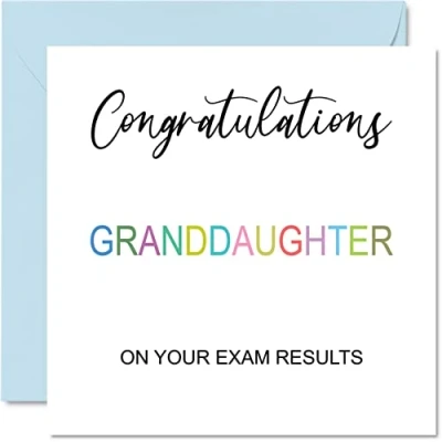 MAKE THEM SMILE WITH THIS CONGRATS CARD: This exceptional quality good for you cards for her or him shows the design "Congratulations Granddaughter On Your Exam Results". If you are looking for well done gifts for women or men, then then this graduation cards female is bound to make them smile. Not just for a graduation cards male this could also be for a Friend, Son, Daughter, Brother, Sister or Cousin. WHAT DO YOU GET: The card is printed on one side and BLANK ON THE INSIDE to allow you to write your very own message. The unique fun design is printed on a specially sourced and environmentally responsible board. At 360 microns thick the natural white one-sided gloss board has a quality look and feel. Supplied with a coloured gummed envelope to complement the design and ready to be sealed and sent in the post. NO INK SMUDGES: There is nothing worse than writing inside a card to find that the shiny surface makes the ink smudge. This is why we use a high quality one sided coated board. The uncoated side will absorb more of the ink from your pen to make smudging a thing of the past, congratulations on your exam results. SIZES: Greeting Card = 145mm x 145mm, Envelope = 155mm x 155mm, Card Thickness = 360 micron. Great school leavers cards, well done cards, university uni card, exam card, gcse gifts for her, exam cards, university cards for her, degree congratulations card, congratulation card, exam pass gifts. MADE AND QUALITY CHECKED IN THE UK: We print and manufacture all our product right her in the UK so you can be sure of a fast turnaround and a product that is expertly made. Using environmentally responsible premium board our card is conscious of the responsible management of the world's forests - gcse card, congratulations exam results gifts, congratulations on passing your exams card.