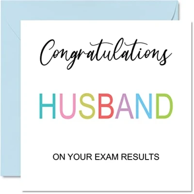 MAKE THEM SMILE WITH THIS CONGRATS CARD: This exceptional quality good for you cards for her or him shows the design "Congratulations Husband On Your Exam Results". If you are looking for well done gifts for women or men, then then this graduation cards female is bound to make them smile. Not just for a graduation cards male this could also be for a Friend, Son, Daughter, Brother, Sister or Cousin. WHAT DO YOU GET: The card is printed on one side and BLANK ON THE INSIDE to allow you to write your very own message. The unique fun design is printed on a specially sourced and environmentally responsible board. At 360 microns thick the natural white one-sided gloss board has a quality look and feel. Supplied with a coloured gummed envelope to complement the design and ready to be sealed and sent in the post. NO INK SMUDGES: There is nothing worse than writing inside a card to find that the shiny surface makes the ink smudge. This is why we use a high quality one sided coated board. The uncoated side will absorb more of the ink from your pen to make smudging a thing of the past, congratulations on your exam results. SIZES: Greeting Card = 145mm x 145mm, Envelope = 155mm x 155mm, Card Thickness = 360 micron. Great school leavers cards, well done cards, university uni card, exam card, gcse gifts for her, exam cards, university cards for her, degree congratulations card, congratulation card, exam pass gifts. MADE AND QUALITY CHECKED IN THE UK: We print and manufacture all our product right her in the UK so you can be sure of a fast turnaround and a product that is expertly made. Using environmentally responsible premium board our card is conscious of the responsible management of the world's forests - gcse card, congratulations exam results gifts, congratulations on passing your exams card.