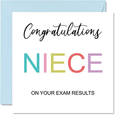 MAKE THEM SMILE WITH THIS CONGRATS CARD: This exceptional quality good for you cards for her or him shows the design "Congratulations Niece On Your Exam Results". If you are looking for well done gifts for women or men, then then this graduation cards female is bound to make them smile. Not just for a graduation cards male this could also be for a Friend, Son, Daughter, Brother, Sister or Cousin. WHAT DO YOU GET: The card is printed on one side and BLANK ON THE INSIDE to allow you to write your very own message. The unique fun design is printed on a specially sourced and environmentally responsible board. At 360 microns thick the natural white one-sided gloss board has a quality look and feel. Supplied with a coloured gummed envelope to complement the design and ready to be sealed and sent in the post. NO INK SMUDGES: There is nothing worse than writing inside a card to find that the shiny surface makes the ink smudge. This is why we use a high quality one sided coated board. The uncoated side will absorb more of the ink from your pen to make smudging a thing of the past, congratulations on your exam results. SIZES: Greeting Card = 145mm x 145mm, Envelope = 155mm x 155mm, Card Thickness = 360 micron. Great school leavers cards, well done cards, university uni card, exam card, gcse gifts for her, exam cards, university cards for her, degree congratulations card, congratulation card, exam pass gifts. MADE AND QUALITY CHECKED IN THE UK: We print and manufacture all our product right her in the UK so you can be sure of a fast turnaround and a product that is expertly made. Using environmentally responsible premium board our card is conscious of the responsible management of the world's forests - gcse card, congratulations exam results gifts, congratulations on passing your exams card.
