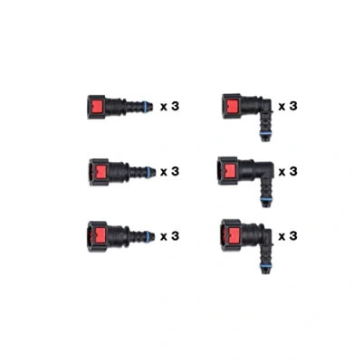 90° angled connectors for AdBlue, sizes: 9.49mm x 6mm, 7.89mm x 6mm & 6.3mm x 6mm. Straight connectors for AdBlue, sizes: 9.49 x 6mm, 7.89 x 6mm & 6.3 x 6mm. Constant running pressure: 7 bar (101psi); max pressure: 9 bar (130psi). Operating temperature: -40°C to 70°C. Body manufactured from nylon PA12; O-ring from EPDM seal. Made to SAE J2044-2009 standards. Red tab for AdBlue identification (note: standard fuel connectors have grey tabs). Top up packs available (3pc). For angled quick connectors, please see Connect Part Nos. 34241 (6.3 x 6mm), 34243 (7.89 x 6mm), 34247 (9.49 x 6mm); for straight quick connectors, Part Nos. 34240 (6.3 x 6mm), 34242 (7.89 x 6mm), 34246 (9.49 x 6mm).
